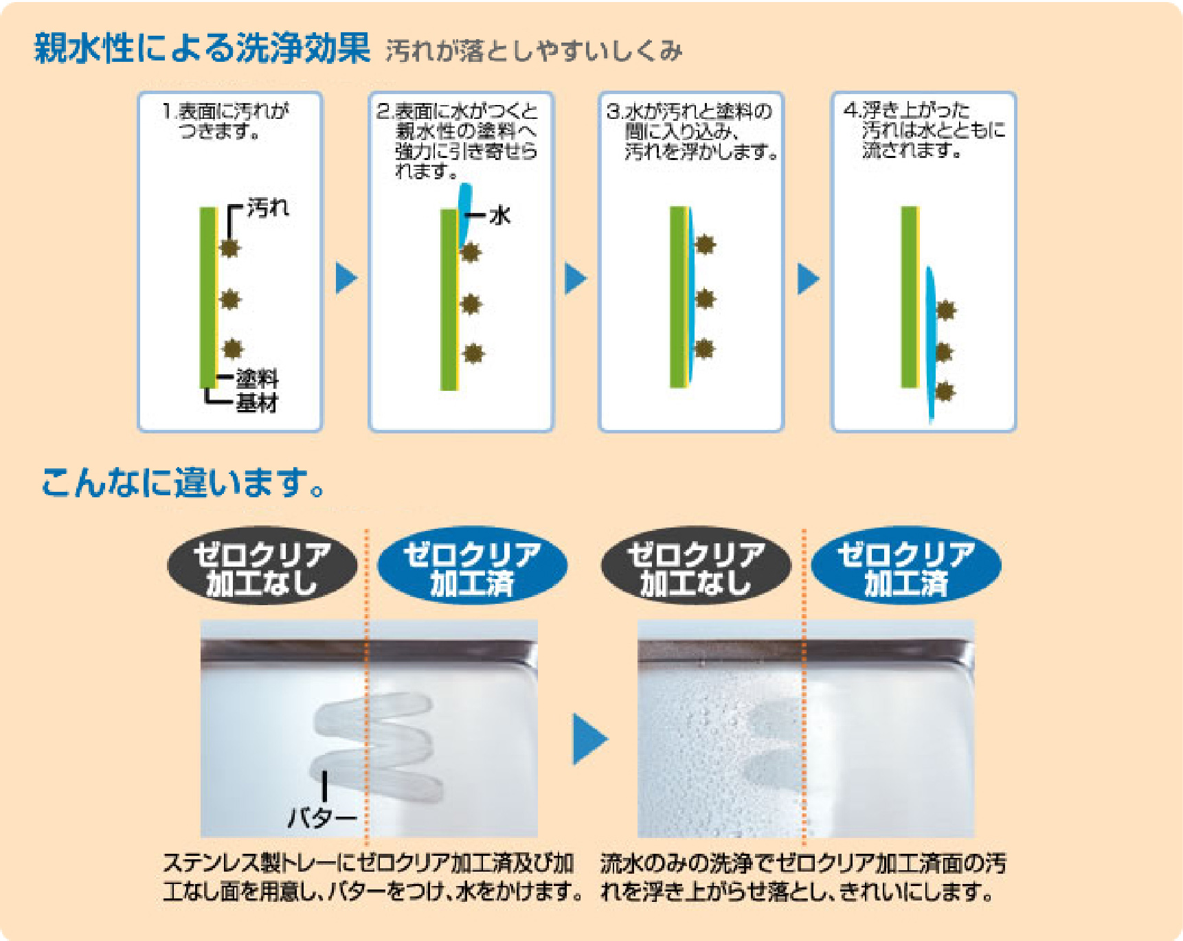 - 油汚れの洗浄が容易のため、作業する人の負担を軽減し、時間の節約にもつながります。