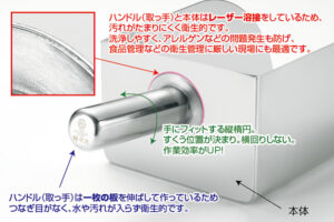 ハンドル(取っ手)と本体はレーザー溶接をしているため、汚れがたまりにくく衛生的です。洗浄しやすく、アレルゲンなどの問題発生も防げ、食品管理などの衛生管理に厳しい現場にも最適です。