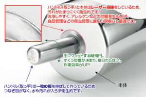 ハンドル(取っ手)と本体はレーザー溶接をしているため、汚れがたまりにくく衛生的です。洗浄しやすく、アレルゲンなどの問題発生も防げ、食品管理などの衛生管理に厳しい現場にも最適です。