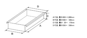 | サイズ範囲 | A寸法:最小300~最大1,000mm B寸法:最小200~最大500mm C寸法:最小25~最大175mm D寸法:最小340~最大1,040mm E寸法:最小240~最大540mm F寸法:最小45~最大195mm |