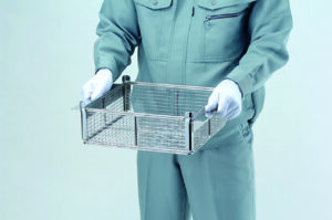 既製の洗浄カゴ、ストックカゴを使用してすぐに破損した事はありませんか?当社では独自に製作した溶接網Φ1.5mm-10Pを使用し、コーナー部を板材で保護をした丈夫な角型バスケットを規格品以外の特注サイズにて製作します。