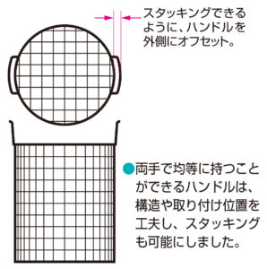 両手で均等に持ち上げられるハンドル付き丸型バスケットを採用。