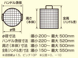 | サイズ範囲 | Φ径寸法:最小200~最大500mmハンドル含径寸法:最小220~最大520mm高さ(本体)寸法:最小100~最大500mm全高(ハンドル含)寸法:最小150~最大550mm |