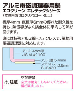 底には特殊アルミ鋼 + ステンレスで、業務用電磁調理器に対応します。