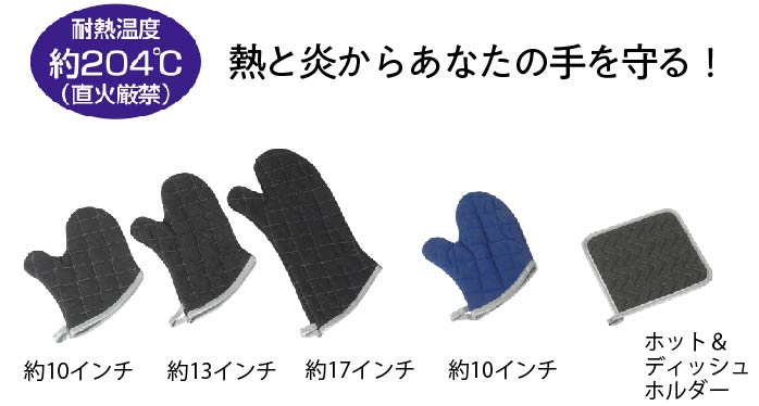 サイズ(インチ) 全長(mm) 商品コード 10 260 J02400000440 13 330 J02400000450 17 420 J02400000460 耐熱オーブンミット 青 ラベル付